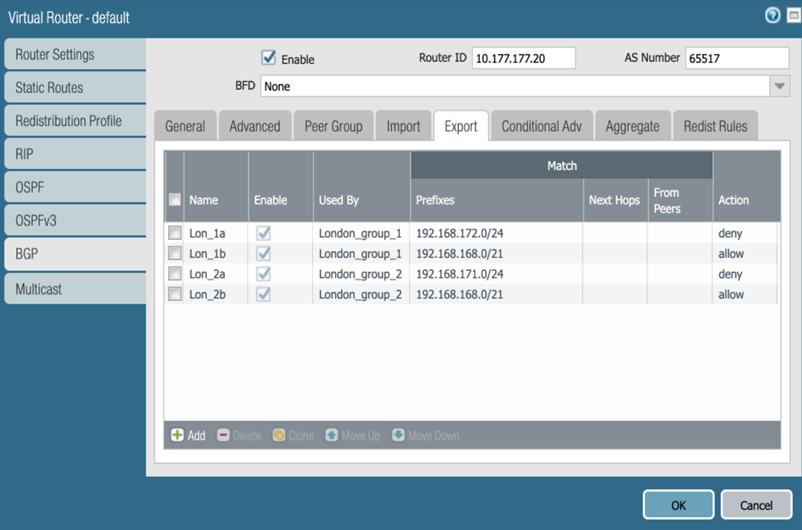 Enter Export settings to ensure that the tunnels advertise the correct subnets.In this example, you specify an Action of deny and allow for the subnets so that the first subnet (192.168.171.0/24) is reachable from tunnel.1 and the second subnet (192.168.172.0/24) is reachable from tunnel.2.