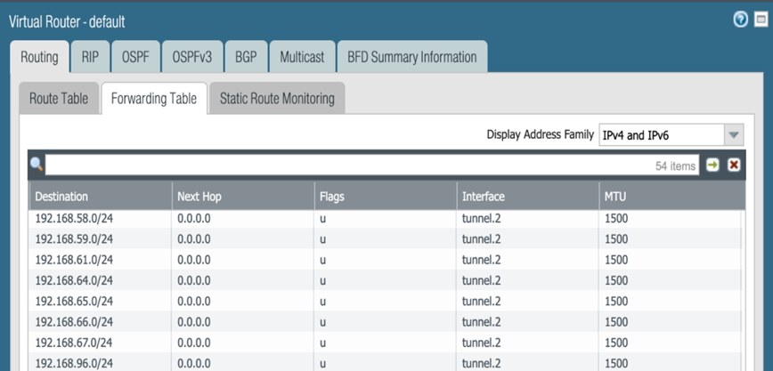 (Deployments with more than two service connections only) If you require more than two service connections to connect the users to private resources for more than 2 Gbps bandwidth, add AS-PATH prepends for the exported routes so that the service connections use symmetric routing to and from the data center in the event of a failover. See Configure More than Two Service Connections to a Headquarters or Data Center Location for details.To ensure symmetric return (to make sure that traffic from 192.168.171.0/24 always uses tunnel.1 and traffic from 192.168.172.0 always uses tunnel.2), enter PBF or policy-based routing rules.By default, BGP installs routes in the routing table for all different destinations regardless of the preferred tunnel. The following screenshot shows that BGP advertises all destinations from the 192.168.168.0/21 subnet for tunnel.2, which might cause asymmetric routing for traffic from 192.168.171.0/24.