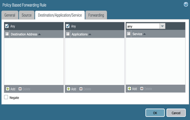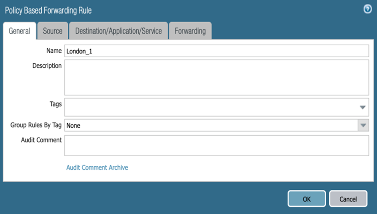 To ensure symmetric routing, configure a set of PBF or route-based forwarding rules. If you are using a next-generation firewall as the CPE, complete the following steps.- Select PoliciesPolicy Based Forwarding and Add a PBF policy rule.
