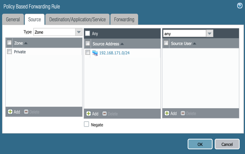 Select Source and Add a Source Address to use for the PBF.In this case, you want to create a PBF for tunnel.1, so you enter the 192.168.171.0/24 subnet.