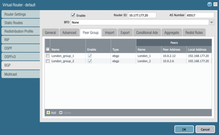 Create virtual router settings for the CPE.You create BGP routing instances that advertise one subnet on one tunnel and the other subnet on another tunnel, which ensures load balancing on the two active tunnels.If you are using a next-generation firewall as the CPE, select NetworkVirtual Routers, Add virtual router settings, then Add a BGP Peer Group for each tunnel, specifying the following settings:- Specify a Router ID and AS Number of the CPE router (10.177.177.20 and 65517, respectively, in this example).