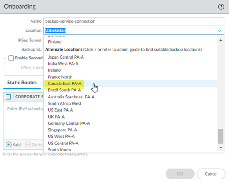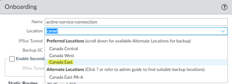 - (Existing Prisma Access Deployments Only) If you have upgraded your plugin to a version that supports cloud provider redundancy, perform a Commit and Push operation after you upgrade to the supported plugin.Service connection multi-cloud redundancy is supported starting with Prisma Access 3.1 Preferred and Innovation. After you upgrade the Cloud Services plugin, you must perform a Commit and Push to have the cloud redundancy changes appear in the UI.If you have a new deployment (not an upgrade), skip this step.Create the service connections to be used as active and backup service connections in a site.After you create Preferred and Alternate locations and Commit and Push your changes, you cannot change these locations. For example, you cannot change the Preferred location from Canada East to Canada East PA-A and you cannot change the Alternate location from Canada East PA-A to Canada East.