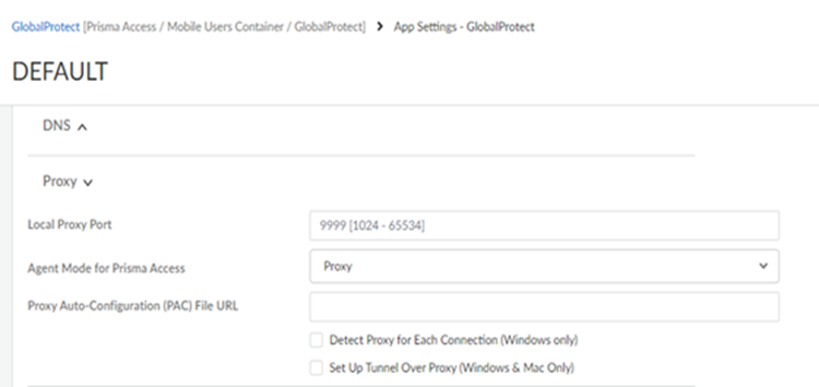 - Set Agent Mode for Prisma Access to Proxy to instruct the GlobalProtect app to send the internet traffic to the Explicit Proxy on Prisma Access.