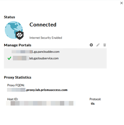 Click Save and Push Config to GlobalProtect and Explicit Proxy.Verify and troubleshoot the agent proxy deployment.- Verify the information about your network connection on the GlobalProtect app Connections tab under Settings.