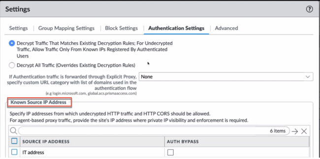- Enable the Agent-based Proxy functionality (Proxy mode and Tunnel and Proxy mode) for mobile users.Navigate to Cloud ServicesConfiguration Mobile UsersExplicit ProxySettingsAuthentication Settings and add the branch egress IP address under Known Source IP Address.