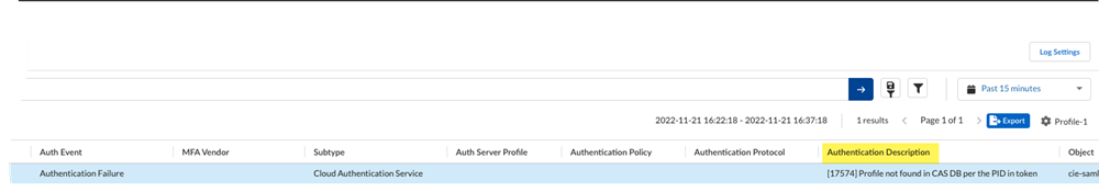 - From Prisma Access (Managed by Strata Cloud Manager), select Incidents & AlertsLog ViewerFirewall/Authentication.View the Auth Event status.If the authentication fails, view the Authentication Description for more details about the failure.