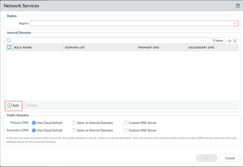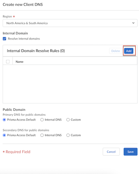 Currently, Internal Domain Resolve Rules is only supported for Prisma Access Browser and Agent Proxy.Add and define the Internal Domain Resolve Rules.Add a unique Name for the rule and a custom IP address under Primary DNS and Secondary DNS.Select Prisma Access Default to use the default Prisma Access DNS server to resolve internal domains. If you want your internal DNS server to only resolve the domains you specify, enter the domains to resolve in the Domain List.If you have a Custom DNS server that can access your internal domains, specify the Primary DNS and Secondary DNS server IP addresses.