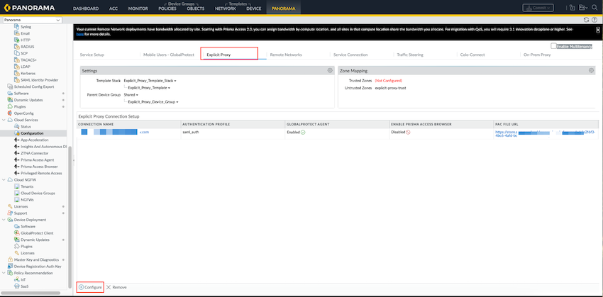- Go to PanoramaCloud ServicesConfigurationExplicit ProxyExplicit Proxy Connection Setup.Select ConfigureNetwork Services.
