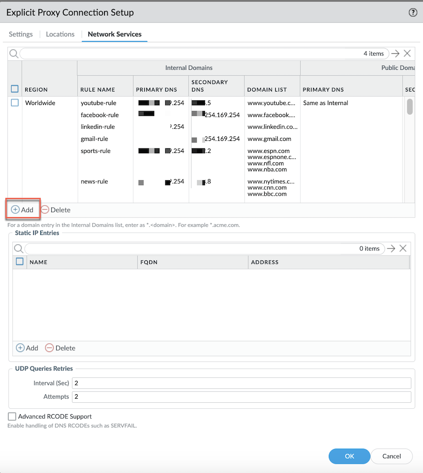 If you have a Custom DNS Server that can access your internal domains, specify the Primary DNS and Secondary DNS server IP addresses.Select OK to save the region and the rule.Use Static IP entries to resolve FQDNs to specific IP addresses.Add UDP Queries Retries. You can add Interval (Sec) and specify the number of Attempts for the query.If you want to enable handling of DNS RCODEs, enable Advanced RCODE Support to allow the primary DNS server to fail over to the secondary DNS server, and OK.A DNS response code of SERVFAIL refers to a communication error with the primary DNS server, and a DNS response code of REFUSED means that the primary DNS server refused to provide the requested information. In both cases, the service fails over to the secondary DNS server.Commit and push to Explicit_Proxy_Device_Group.