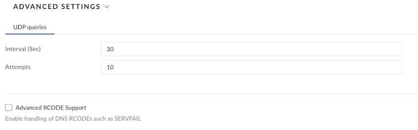 If you want your internal DNS server to only resolve the domains you specify, enter the domains to resolve in the Domain Lists. Specify an asterisk in front of the domain; for example, *.acme.com.Use Static IP entries to resolve FQDNs to specific IP addresses.Add UDP Queries. You can add Interval (Sec) and specify the number of Attempts for the query.If you want to enable handling of DNS RCODEs, enable Advanced RCODE Support to allow the primary DNS server to fail over to the secondary DNS server, and Save.A DNS response code of SERVFAIL refers to a communication error with the primary DNS server, and a DNS response code of REFUSED means that the primary DNS server refused to provide the requested information. In both cases, the service fails over to the secondary DNS server.