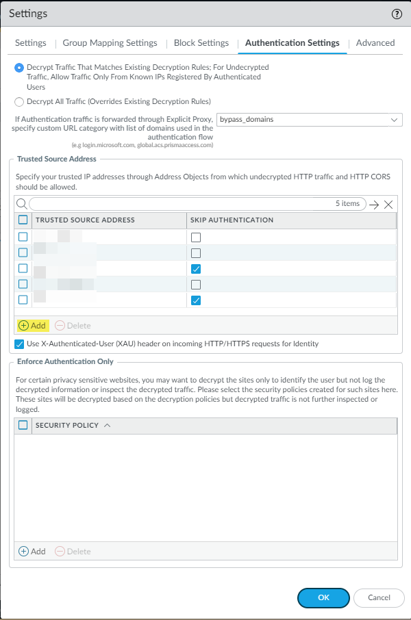 Add addresses to the Trusted Source Address field.If you do not add the egress endpoint IP addresses to the trusted list, Explicit Proxy forces users and machines to authenticate with SAML as well as Kerberos.Enter a maximum of 100,000 IP addresses.