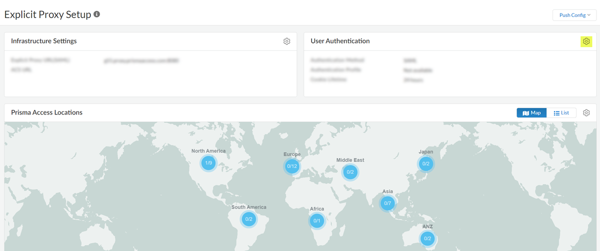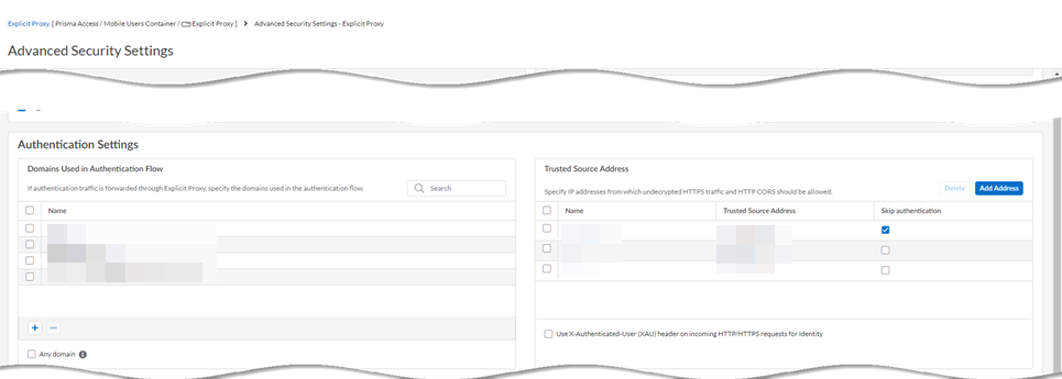 Save your changes.(Optional) Add the egress IP addresses of the branch or campus location where your users, servers, IoT devices, or headless machines are located to the list of trusted Explicit Proxy addresses.You need to do this only if you want to Skip Authentication for specific IP addresses or Use X-Authenticated User (XAU) header on incoming HTTP/HTTPS requests for identity.- Go to Configuration NGFW and Prisma Access and set Configuration Scope to Prisma Access. Select Explicit ProxyAdvanced Security Settings.