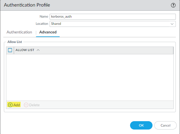 Select OK to save your changes.Create an allow-all policy rule for user authentication.- Select PoliciesPre Rules + Add.Name the rule.Select SourceSet Source User to known-userSet all other required values to Any.Select OK to save the rule.Commit and push your configuration changes.Verify that Kerberos authentication is working with Prisma Access by viewing the traffic and authentication logs. Logs are generated only in case of authentication failure.