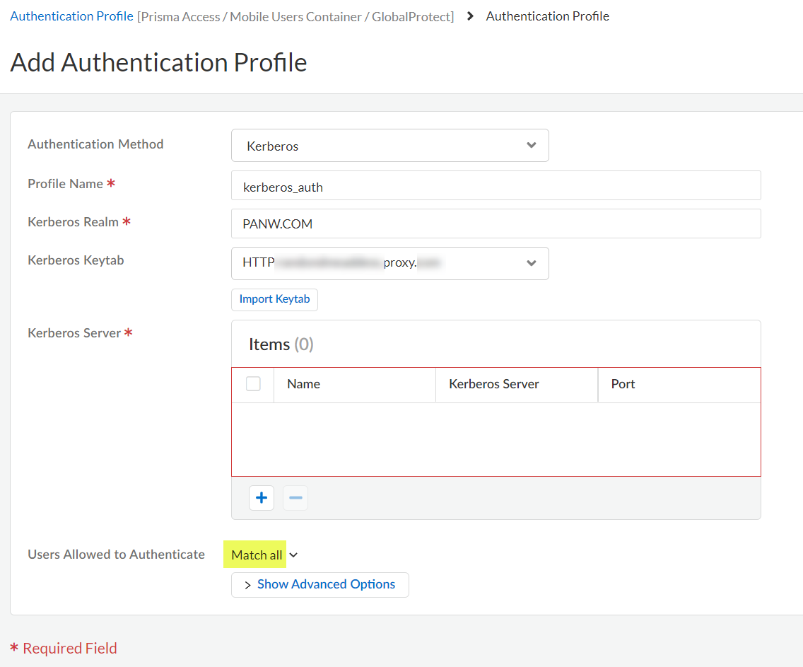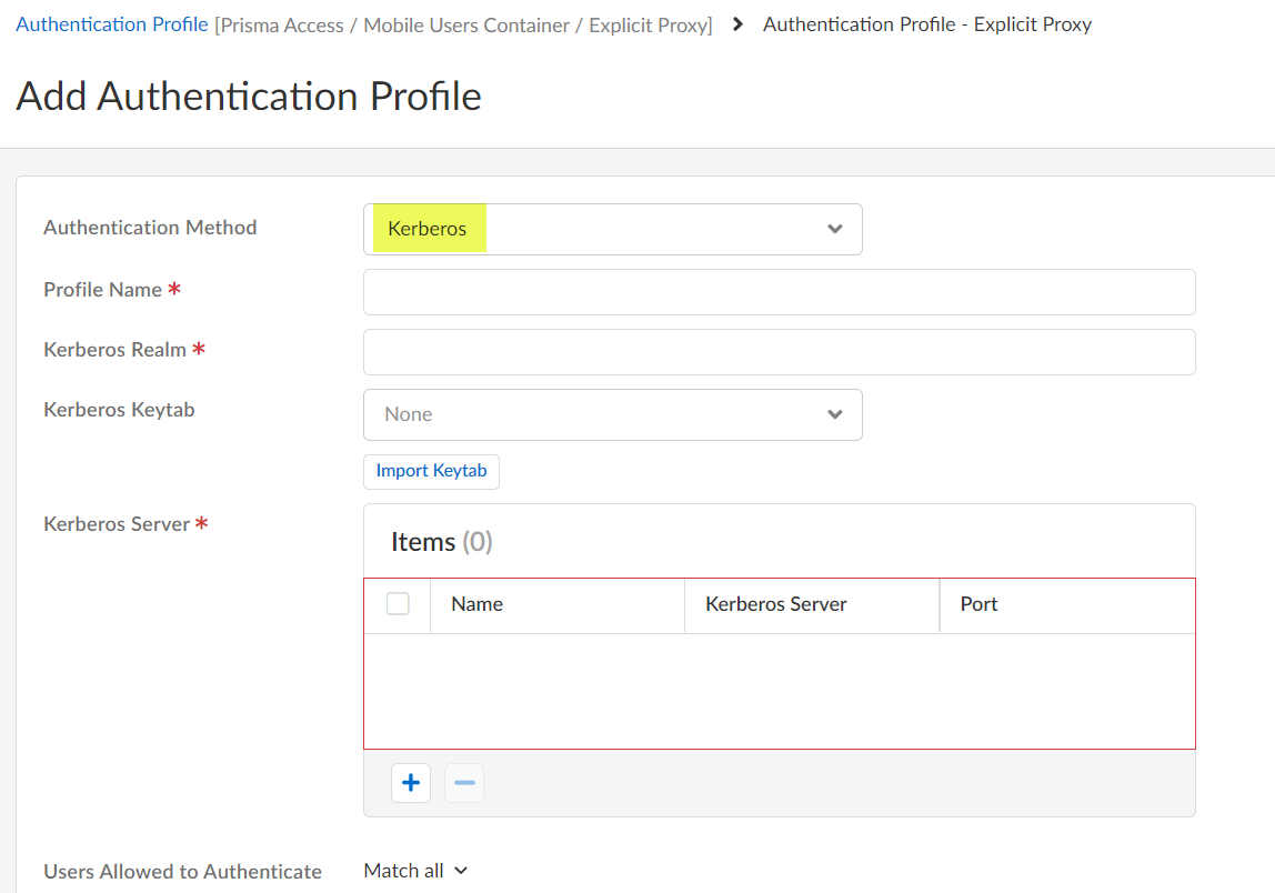 Find out how to configure Kerberos authentication for Explicit Proxy on Prisma Access.- Set up a Kerberos authentication profile.The profile defines how Explicit Proxy connects to the Kerberos server for mobile user authentication.