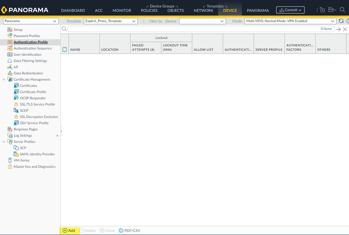 - Go to ConfigurationNGFW and Prisma AccessIdentity ServicesAuthenticationAuthentication Profiles and Add Profile.