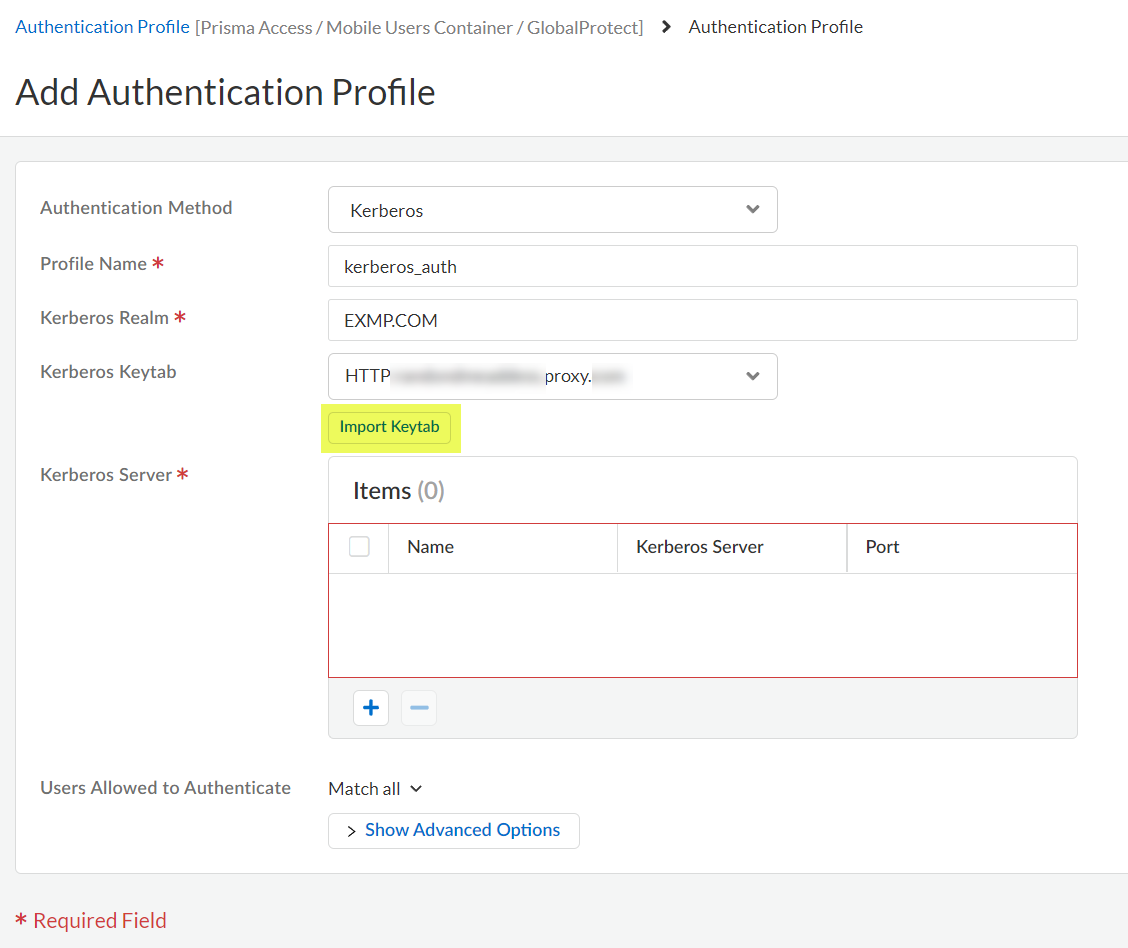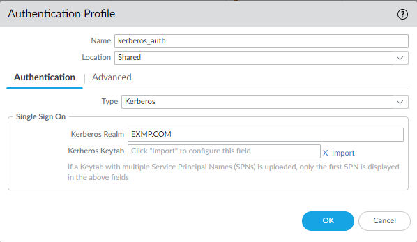 Enter the Profile Name to identify the server profile.The authentication profile specifies the server profile that the portal or gateways use when they authenticate users.Enter the Kerberos Realm (up to 127 characters) to specify the hostname portion of the user login name. For example, the user account name user@EXMP.COM has the realm EXMP.COM.Import the Kerberos Keytab (Import Keytab) youcreated earlier.