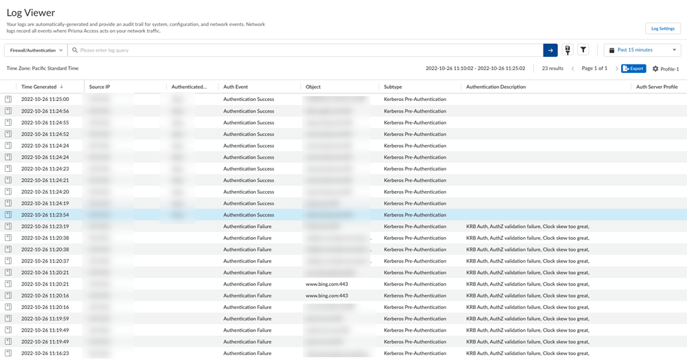 - (Decrypted traffic only) Go to ActivityLog ViewerFirewall/Traffic and check that the Kerberos authentication is working.If you're using Strata Cloud Manager, go to Incidents & AlertsLog ViewerFirewall/Traffic.Decrypted traffic displays the user name in the traffic logs.(Undecrypted traffic only) Go to ActivityLog ViewerFirewall/Authentication and check that Kerberos authentication is working correctly.If you're using Strata Cloud Manager, go to Incidents & AlertsLog ViewerFirewall/Authentication.The following fields provide more information about the authentication event: