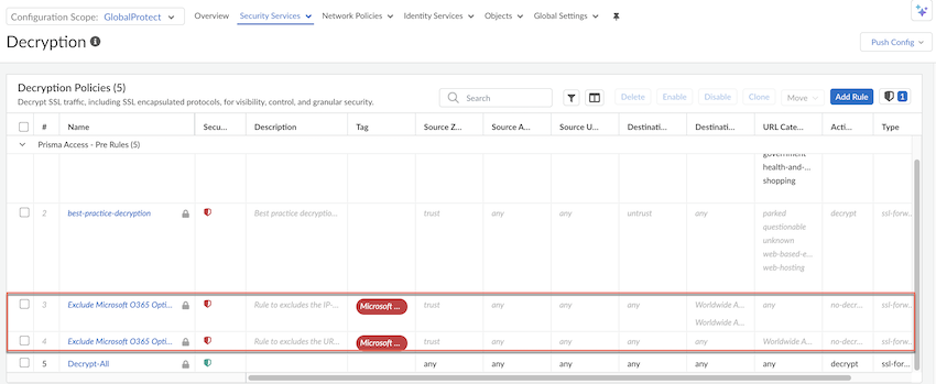 Enable the predefined Exclude O365 Optimized Endpoints- IPs and Exclude O365 Optimized Endpoints- URLs decryption rules as recommended by Microsoft. Zero-touch synchronization automatically keeps endpoint lists up to date with Microsoft, providing customers an overall control over relevant Microsoft endpoints.