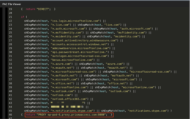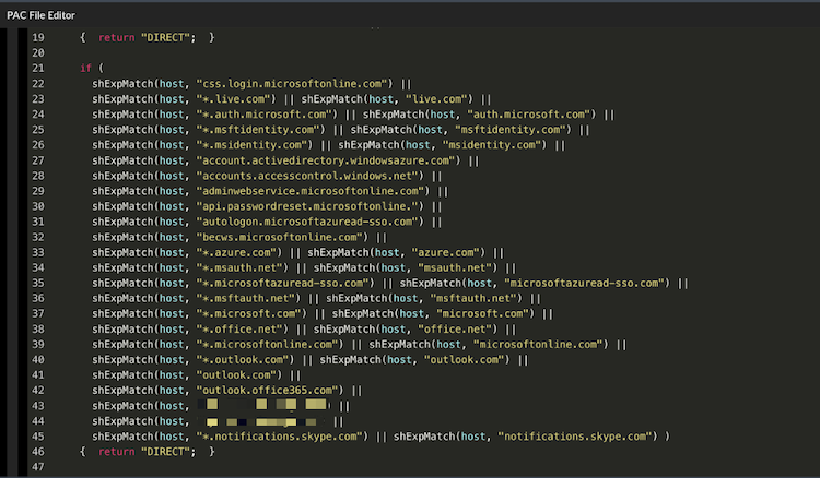 4. Download the PAC file and modify the return statement to DIRECT for the Office 365 domains.