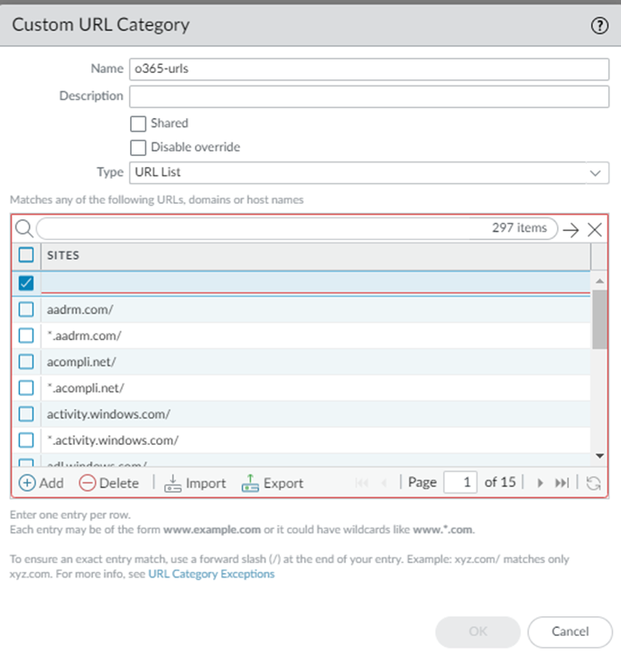 To simplify the uploading of the URLs, you can copy the list of Office 365 URLs at https://saasedl.paloaltonetworks.com/feeds/m365/worldwide/any/all/url, save those URLs to a file, and Import the file to the Custom URL category.