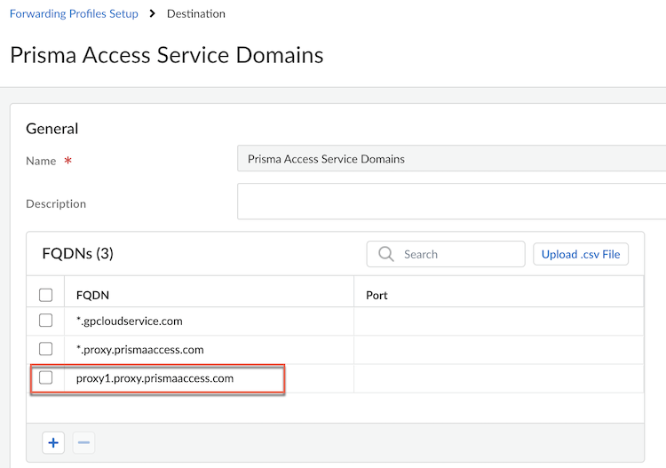 8. Go to Destination, select Prisma Access Service Domains and add your proxy FQDN proxy1.proxy.prismaaccess.com to the destination group. Save and Push Config to push the configuration.