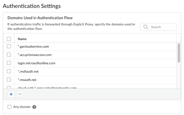 To add the domains to the authentication bypass list, go to ConfigurationNGFW and Prisma AccessConfiguration ScopePrisma AccessExplicit ProxyAdvanced Security SettingsDomains Used in Authentication Flow.