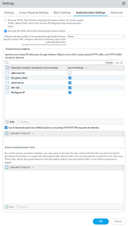 Click OK when finished.(Optional) Configure Block Settings.Use Block Settings to block access to an internet destination at the DNS resolution stage.To restrict access to explicit proxy to specific source IP addresses, you can also use special objects. These Address Objects, Address Groups, and External Dynamic Lists (EDLs) that use specific names allow the IP addresses you specify for internet traffic and block any other IP addresses.In the Authentication Settings tab, configure decryption, X-Authenticated-User (XAU), and authentication settings.- Configure your settings for decrypted traffic.