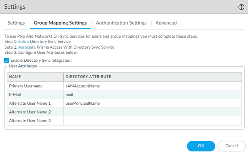 In the Group Mapping Settings tab, Enable Directory Sync Integration (now known as the Cloud Identity Engine) to configure Prisma Access to use the Cloud Identity Engine to retrieve user and group information.You use the Cloud Identity Engine to populate user and group mapping information for an explicit proxy deployment.Enter mail for the Directory Attribute in the Primary Username field and mail for the E-Mail field.