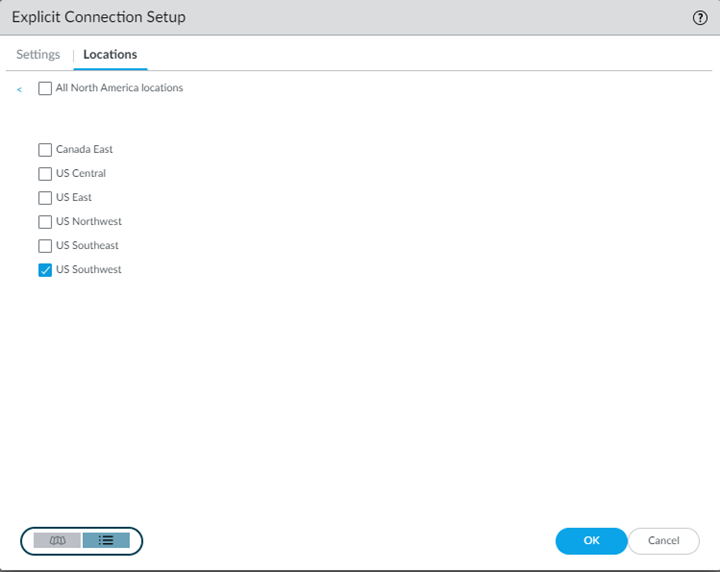 In addition to the map view, you can view a list of regions and locations. Choose between the map and list view from the lower left corner. In the list view, the list displays regions sorted by columns, with all locations sorted by region. You can select All sites within a region (top of the dialog).