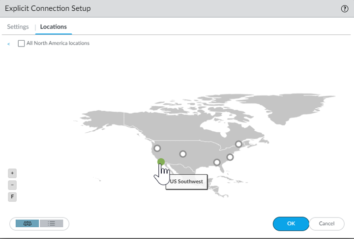Select one or more explicit proxy locations within your selected region using the map.Hovering your cursor over a location highlights it. White circles indicate an available location; green circles indicate that you have selected that location.