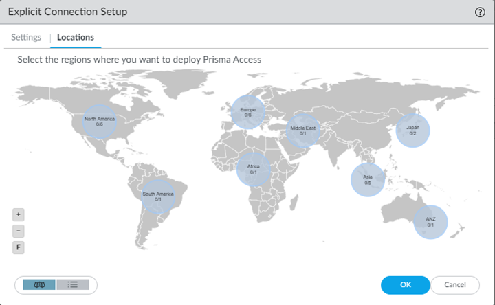 Select the Locations and the regions associated with those locations where you want to deploy your explicit proxy for mobile users. Prisma Access adds a proxy node into each location you select.Explicit proxy supports a subset of all Prisma Access locations. See Explicit Proxy Configuration Guidelines for the list of locations.The Locations tab displays a map. Highlighting the map shows the global regions (Americas, Europe, and Asia Pacific) and the locations available inside each region. Select a region, then select the locations you want to deploy in each region.You should enable explicit proxy locations in at least two regions to ensure regional redundancy.- Click the Locations tab and select a region.