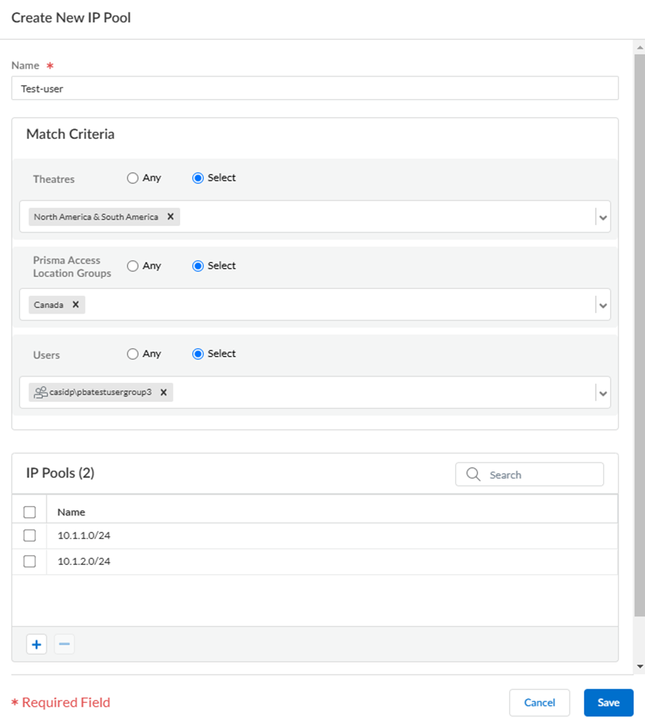 Define the criteria to assign the IP address to mobile users.- Give the IP address pool a unique Name.Select one or more of the Theatres to allow the pool to be used in those theaters, or select Any to allow the pool to be used in all theaters.Select one or more of the Prisma Access Location Groups to allow the pool to be used in that location group, or select Any to allow the pool to be used in all location groups.Select a user or user group to assign an IP address based on the User-ID or user group, or select Any to allow IP address assignment to be based on other criteria.To assign one or more users or user groups to an IP address pool, select the user or user groups in the Users or User Groups tab.In the IP Pools area, enter an IP address pool.To limit a user to a single IP address, specify a /30 or /32 IP address; Prisma Access assigns the user to that address. Since a /32 would provide only one IP address, we recommend a minimum subnet of /30 and restricting the user to that subnet.(Optional) Enter a Lease Period and a Grace Period for the user-to-IP address mapping.Save your changes.