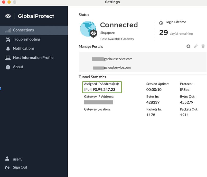 Verify your changes by going to GlobalProtectSettings on the client machine, viewing the Tunnel Statistics, and verifying the Assigned IP Address(es).