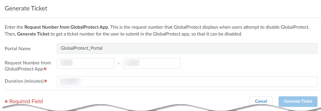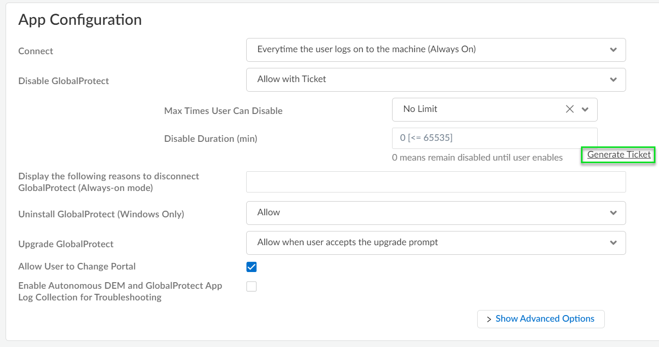 Instead of enabling users to directly disable GlobalProtect, you can allow a user to request for GlobalProtect to be disabled via a ticket.