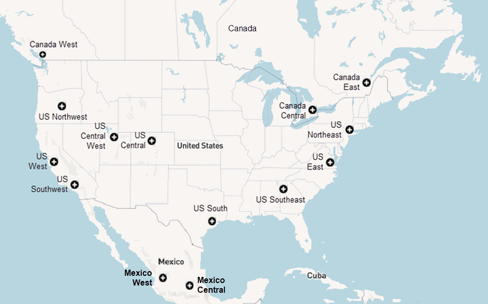 - Map of North America Locations—To help you select locations in North America, refer to this map that shows the geographic coverage for North American locations.