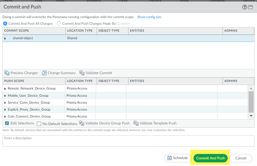 - Log in to the Panorama that manages Prisma Access with an administrative role of Superuser.(Optional) If you have configured a custom Master Key for your Panorama and for Prisma Access, make a note of it.If your deployment uses the default Master Key, this step isn't required.Make sure that your current Panorama configuration is up to date and you have committed and pushed all your changes to Panorama and to Prisma Access by going to CommitCommit & Push and Preview Changes.(Optional) Check the diffs between the running config and the candidate config and determine whether you want to push those changes. If you want to commit and push the changes, Edit Selections and select the Prisma Access components you want to push in the Push Scope.