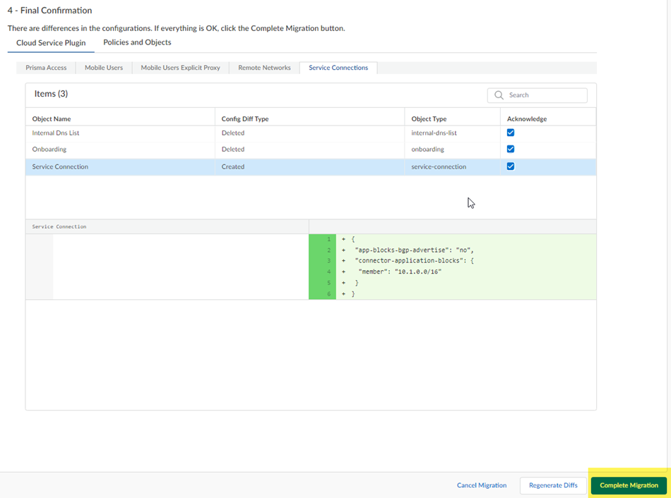 If the migration program made changes, review them in the final confirmation screen.The migration program might make changes to your configuration to account for differences in the Panorama and the Strata Cloud Manager configuration or to fix unsupported functionality. If changes are required, the migration program shows those changes in a diff view with the new lines in green and the deleted lines in red.Ignore any diffs that show the following object names; they don't affect your configuration:- Clientless-vpn crypto-settings