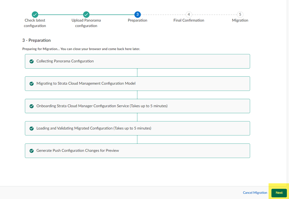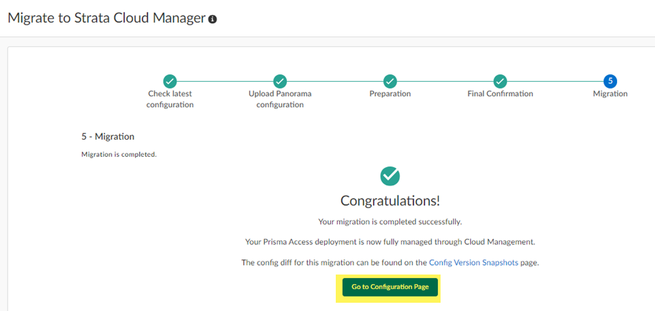 Complete Migration.While not required, you can also Acknowledge your changes.After you Complete Migration, you can't go back to a Panorama managed deployment and your deployment permanently uses Strata Cloud Manager for its management.