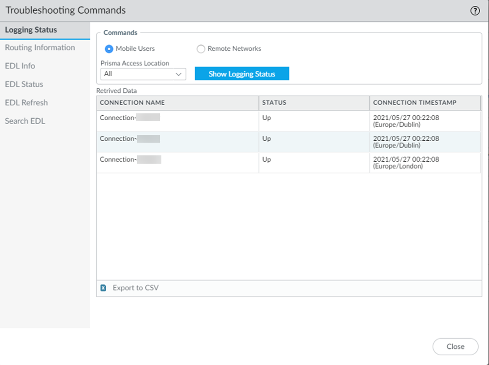 - If you are having issues with receiving logs from one or more locations, you can check the Logging Status for a mobile user or remote network security processing node (SPN) to check the connectivity status of Strata Logging Service with that SPN.