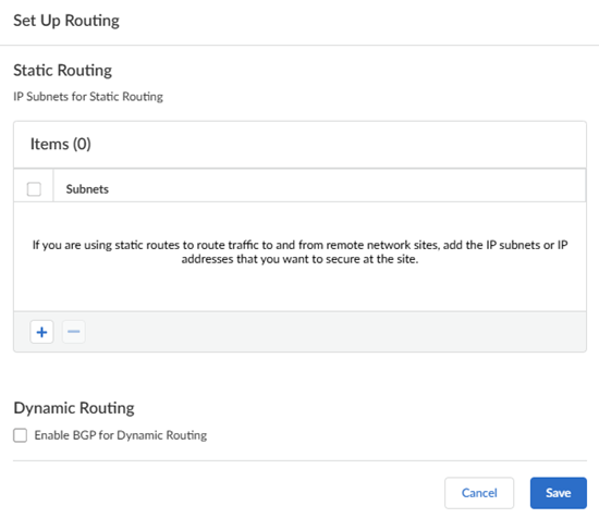 • Static Routes—To enable static routes to and from your remote site to Prisma Access, identify the subnetworks or individual IP addresses at the remote site that you want Prisma Access to secure (for both inbound and outbound traffic). The subnetworks at each site must not overlap with each other, with the IP pools that you designated for Prisma Access for Users, or with the infrastructure subnet.