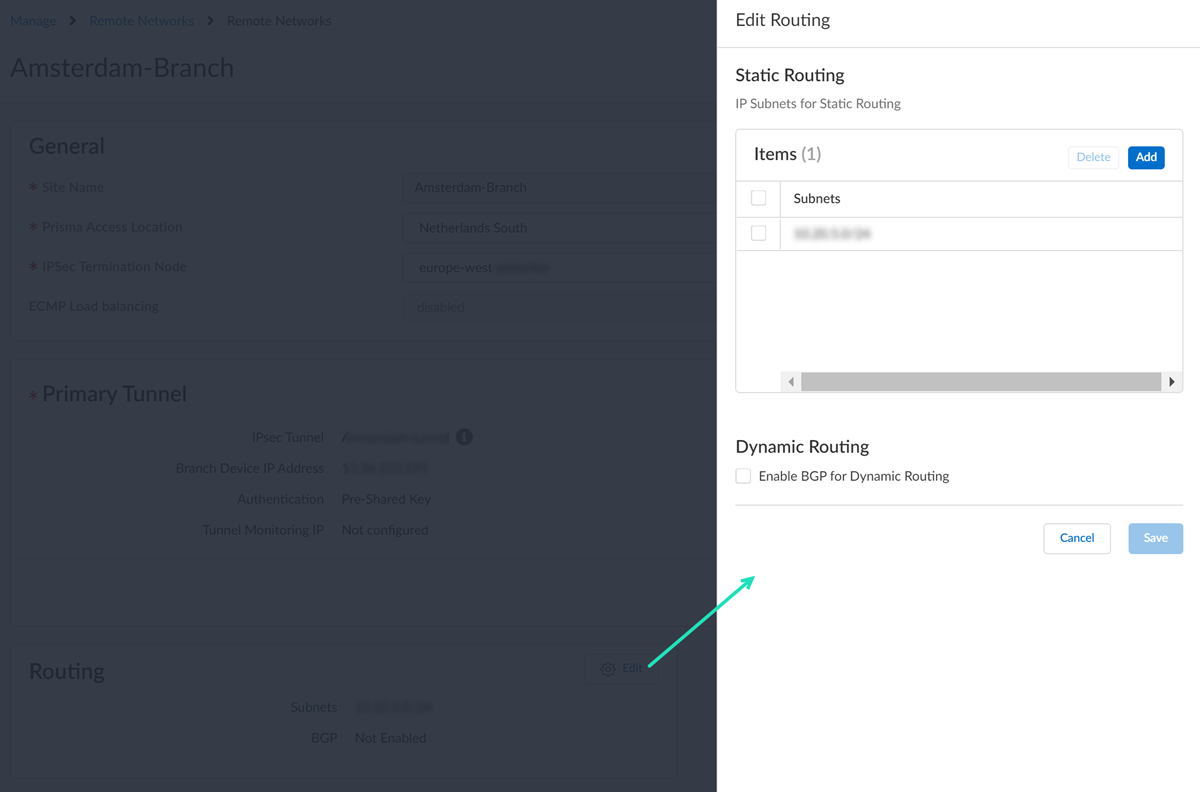 - To add or adjust routing settings, go to ConfigurationNGFW and Prisma AccessConfiguration ScopePrisma AccessRemote Networks and add or edit a remote network site.