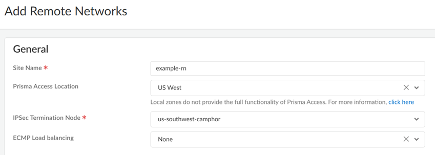 If you need to onboard many remote networks (up to 1,000), you can onboard a remote network using the following procedure, then export the remote network configuration to a CSV file, add the other remote networks you want to onboard to the CSV file, then import the CSV file to save the configuration into Prisma Access.