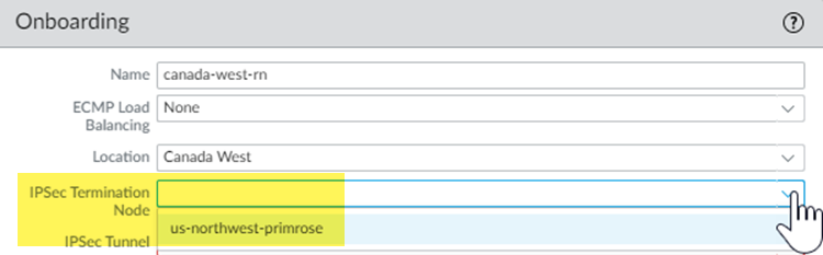 - Select PanoramaCloud ServicesConfigurationRemote Networks, Add a remote network and select the location you want to onboard, and make a note of the IPSec Termination Node choices in the onboarding area.