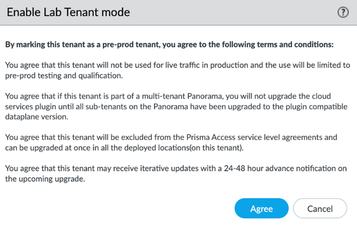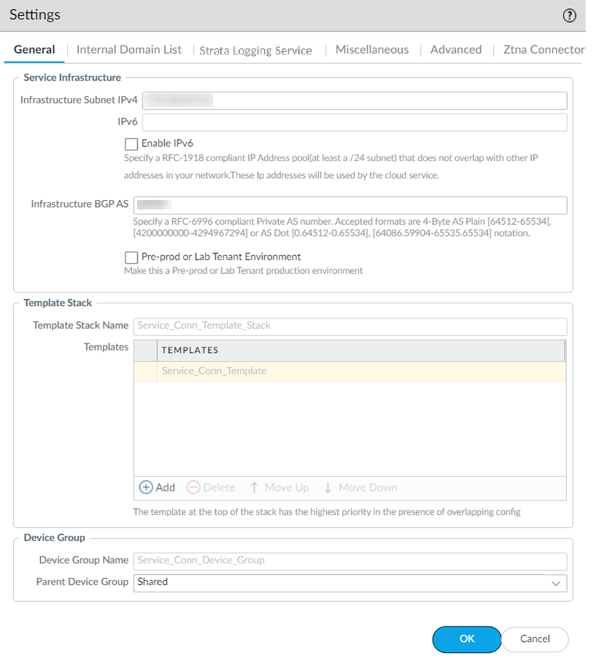 On the General tab, specify an Infrastructure Subnet that meets the requirements, for example, 172.16.55.0/24.(Optional) If you are configuring IPv6, select IPv6 for Internal Traffic and select an IPv6 subnet.(Optional) If you want to enable Prisma Access to use BGP to dynamically discover routes to resources on your remote networks and HQ/data center locations, enter the Infrastructure BGP AS you want to use within the Prisma Access infrastructure.If you do not supply an AS number, the default AS number 65534 will be used.(Optional) Enable a tenant as Pre-prod or Lab Tenant Environment.When you enable a tenant as a pre-production or lab tenant, you can schedule upgrades for this tenant alone before upgrading other production tenants. The tenant receives notifications 24 to 48 hours before an upcoming upgrade.