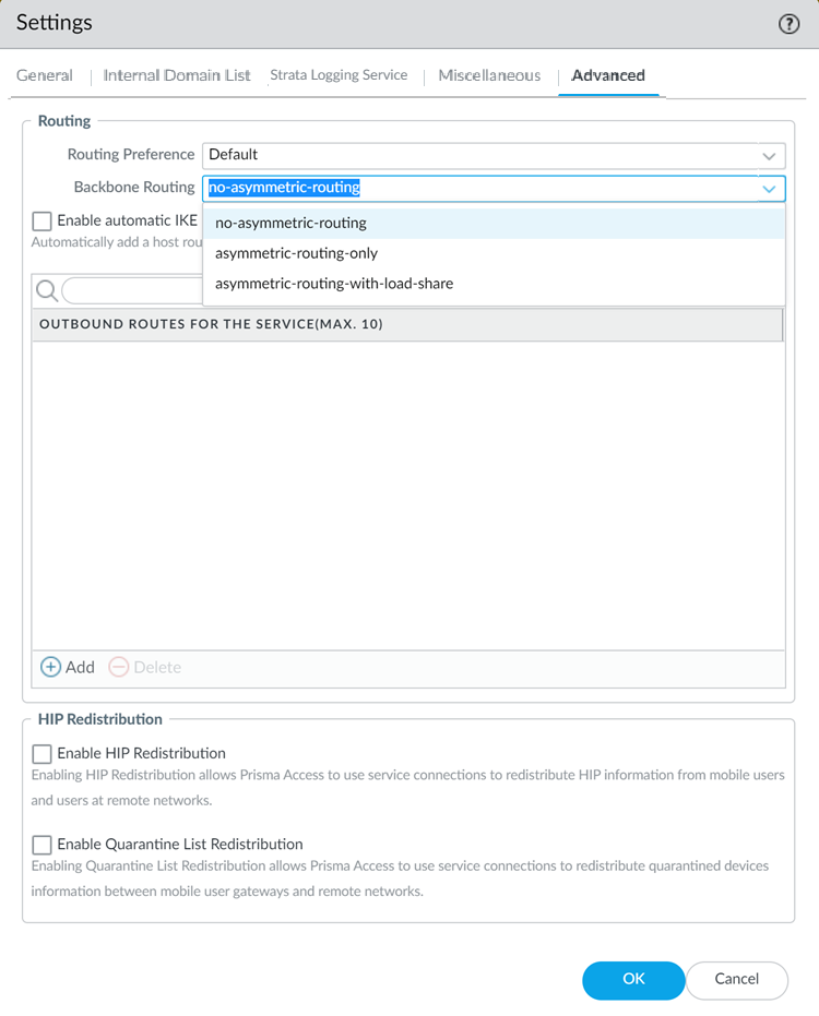 (Optional) Configure Advanced settings (routing preferences, symmetric network path options for service connections, and HIP redistribution).- Specify the Routing Preference to use with service connections.You can specify network preferences to use either your organization’s network, or the Prisma Access network, to process the service connection traffic.