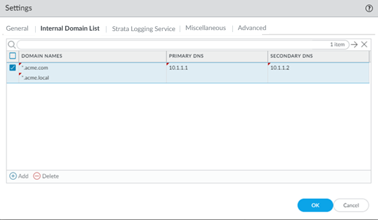 When you disable the tenant from pre-production or lab tenant, it is considered as a production tenant.Prisma Access for Clean Pipe does not support this functionality.(Optional) Enable Prisma Access to resolve your internal domains using your corporate DNS servers.Use this step if you need Prisma Access to be able to resolve your internal domains to access services, such as LDAP servers, on your corporate network via service connections. For example, if you want a DNS lookup for your corporate domain to go exclusively to the corporate DNS server, specify the corporate domain and the corporate DNS servers here.- Select the Internal Domain List tab.Add the Domain Names, Primary DNS, and Secondary DNS servers that you want Prisma Access to use to resolve your internal domain names.You can use a wildcard (*) in front of the domains in the domain list, for example *.acme.local or *.acme.com.Do not enter a 127.0.0.1 address as it can cause Prisma Access internal routing issues.