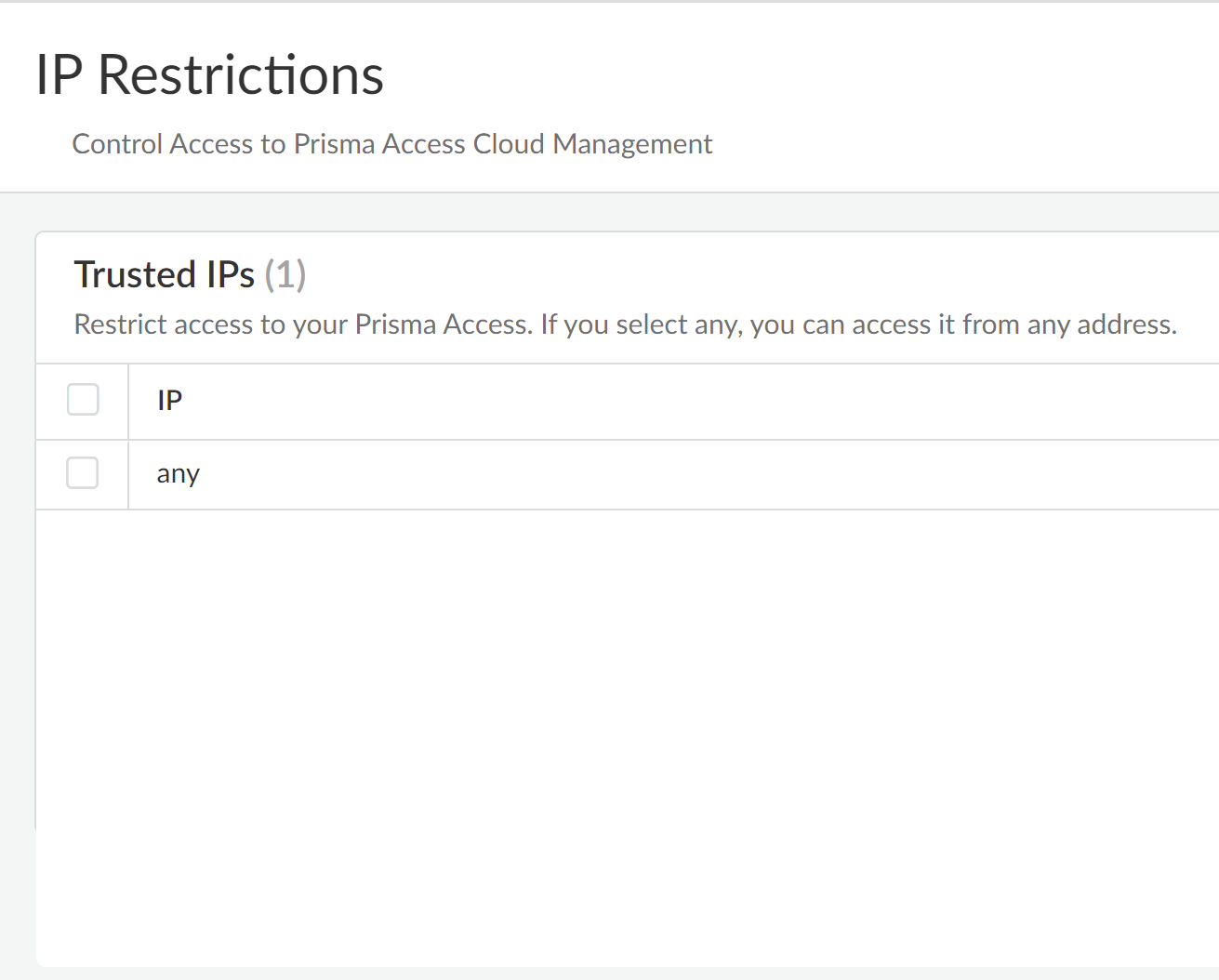 - Launch an internet browser and Sign In to the hub.Launch Strata Cloud Manager.Specify trusted IP addresses for Prisma Access (Managed by Strata Cloud Manager) administrators.Only administrators that log in from these source IP addresses (and also that successfully authenticate) can access Prisma Access (Managed by Strata Cloud Manager). The IP addresses must be public addresses. By default, there aren’t any trusted addresses enforced (the list is set to any). To get started, find the Settings menu on the left navigation panel and click IP Restrictions.