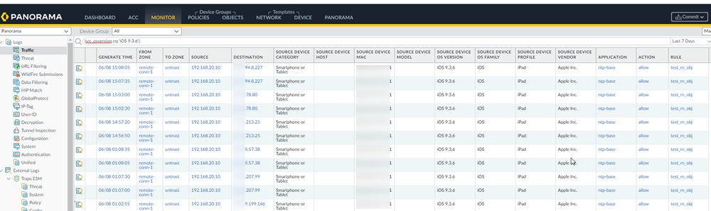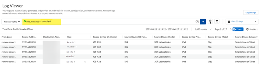 Push Config to save your changes to the Prisma Access configuration, making sure to select Remote Networks in the push scope.Verify that Prisma Access is receiving the Device-ID logs by going to Incidents & AlertsLog Viewer, selecting Firewall/Traffic, and searching for traffic under the rule you created by entering rule_matched = rulename, where rulename is the security policy rule you created for the third-party IoT devices.The Device-ID to IP address mappings display in the logs.