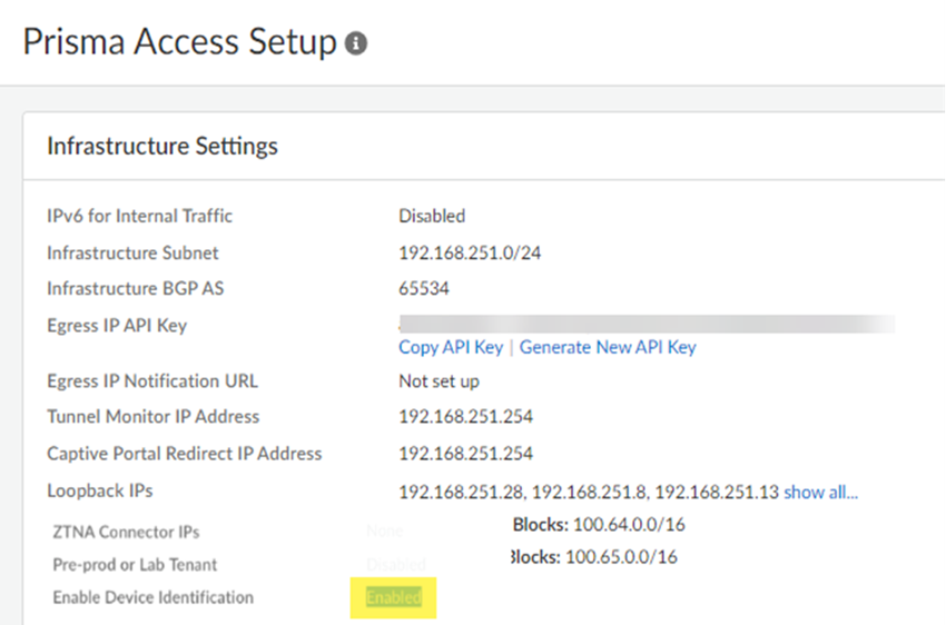 - Activate Third-Party Device-ID in the Cloud Identity Engine.This procedure includes uploading a signed certificate and using that with an API to communicate with, and download Device-ID information from, the third-party IoT vendor.Activate Third-Party Device-ID in Prisma Access by going to SettingsPrisma Access SetupShared or ConfigurationNGFW and Prisma AccessConfiguration ScopePrisma Access Infrastructure and set Enable Device Identification to Enabled.