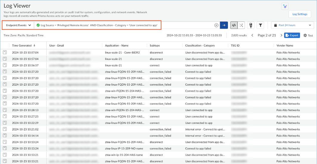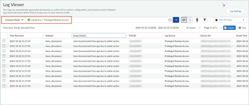 PRA automatically generates logs and sends them to the Strata Logging Service, which provides an audit trail for PRA system and network events. The events will appear in the Log Viewer a few minutes after an event occurs.